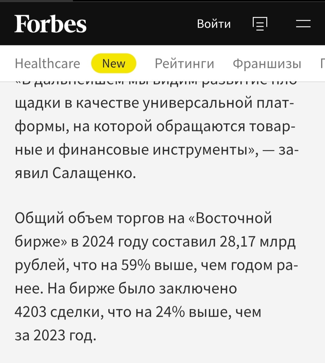 - Итоги торгов «Восточной Биржи» в 2024 году действительно впечатляющие. Подозрительно, что после этих итогов никаких «громких» сделок не происходило — соответственно, неясно, будет ли она функционировать вообще.