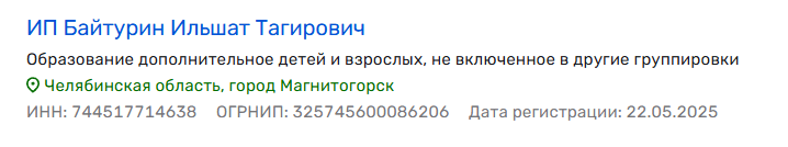 Все услуги коуч оказывает легально. Он зарегистрирован как ИП, а среди видов деятельности указано дополнительное образование. Настораживает лишь дата внесения в реестр — май 2025 года, хотя на тот момент Ильшат работал и продавал свои инфопродукты уже несколько лет.