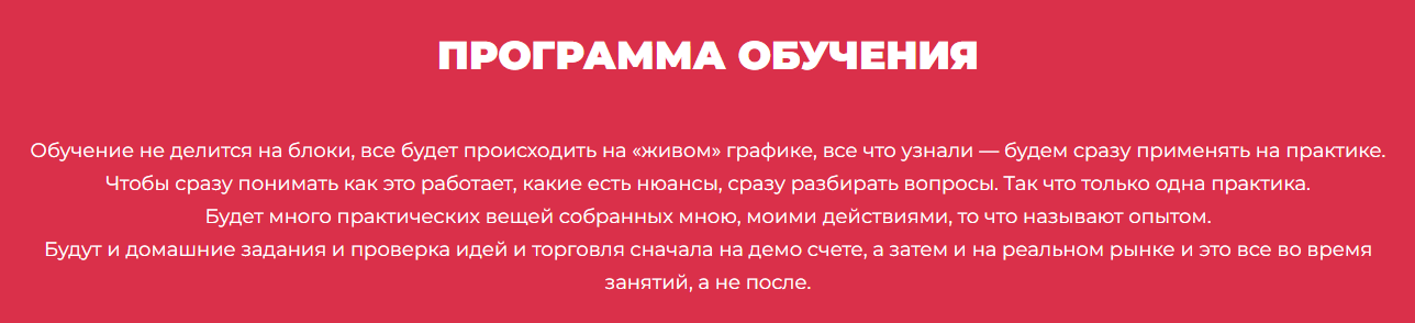 На основное обучение можно записаться через официальный сайт инвестора. Интересно, что в нем нет никаких обозначенных блоков. По утверждениям ментора, его стратегия состоит в том, чтобы сразу тестировать все на реальном графике. Однако как это связано с отсутствием структуры — непонятно.