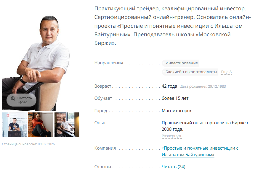 Ильшат называет себя опытным трейдером и квалифицированным инвестором, который торгует на Мосбирже, БКС и других площадках с 2008 года. По заявлениям эксперта, он часто выступает спикером на тематических конференциях и даже имеет публикации в СМИ.