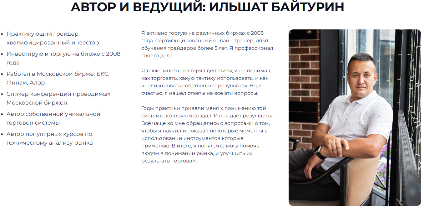 «Все про уровни поддержки и сопротивления» — это один из вебинаров трейдера Ильшата Байтурина, предназначенный для новичков и для опытных инвесторов, В рамках занятия эксперт обещает разобрать все важные моменты технического анализа, научить правильно определять ключевые уровни и торговать с помощью этой информации. Однако более подробно о данном уроке и в целом деятельности специалиста мы расскажем в сегодняшнем обзоре.