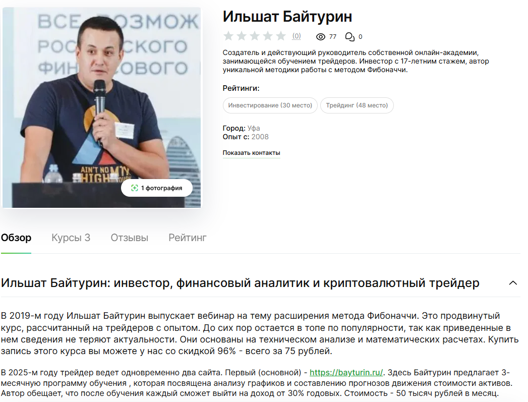 На действительно независимых сайтах о деятельности ментора рассказывают в немного другом ключе. Там, например, пишут, что свой первый вебинар инвестор провел только в 2019-м и посвятил его методу Фибоначчи. Также уделяют внимание странностям в ведении площадок: коуч зачем-то запустил второй ресурс, где большая часть функций не работает.