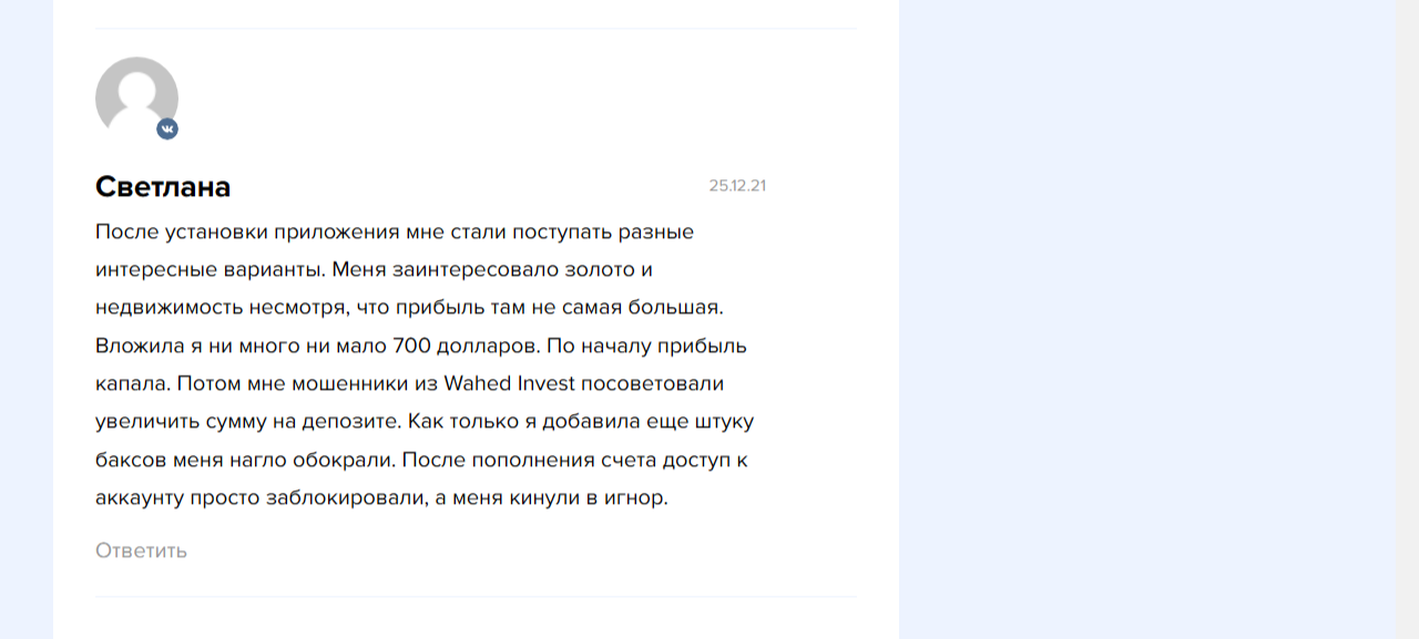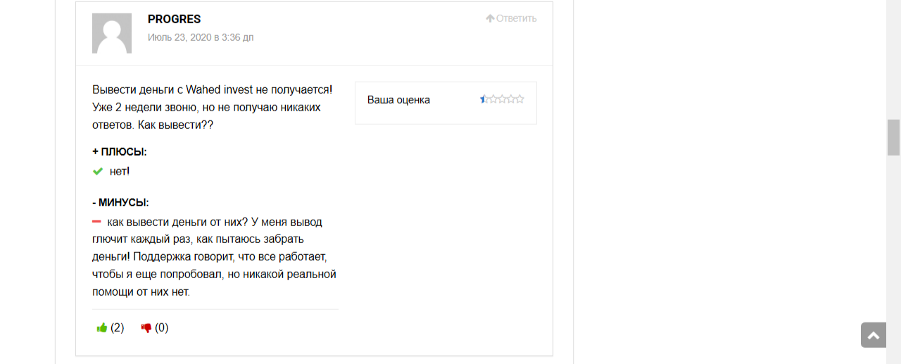 Отзывов о работе инвестиционной площадки в сети нашлось достаточно. Клиенты разделились на два лагеря: половина в восторге от Вахед Инвест, а остальные обвиняют брокера в мошенничестве.