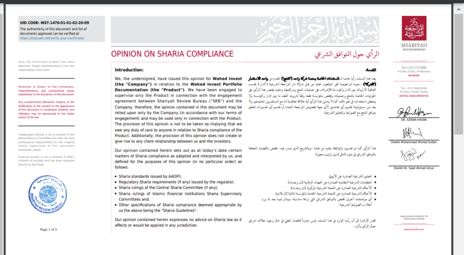 В качестве официальных документов брокер предоставляет только странные мусульманские сертификаты. Якобы они подтверждают то, что Wahed Invest проверен и не нарушает шариат.