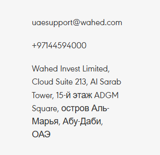 Несмотря на то, что страница обладает множеством разделов, не все из них открываются, а некоторые срабатывают не корректно. Только в футере сайта мелким шрифтом указан адрес компании, номер телефона и электронная почта globalsupport wahedinvest com.