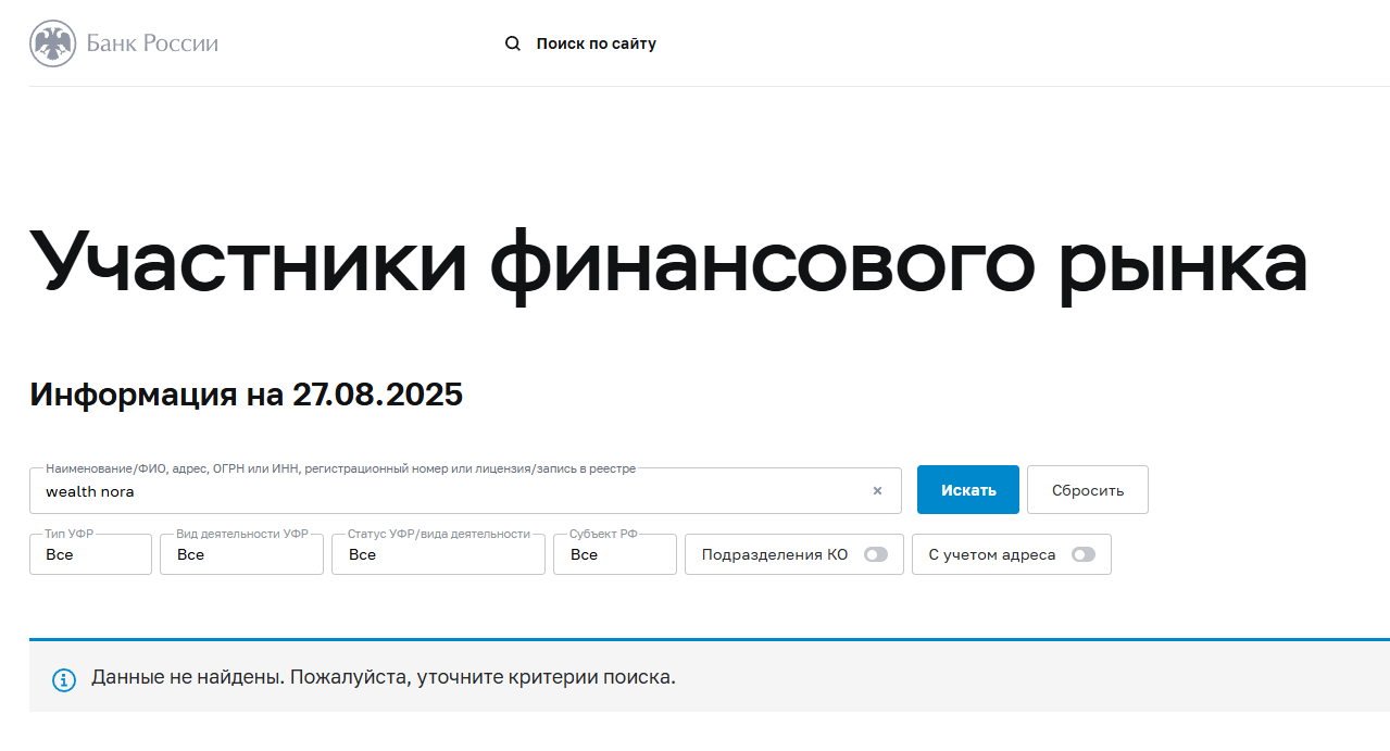 Анализ показал, что Wealth Nora — это не надежный сервис, а опасный проект. У него есть все признаки мошеннической схемы. Вкладывать туда деньги — огромный риск. Вот главные факты, которые это доказывают: