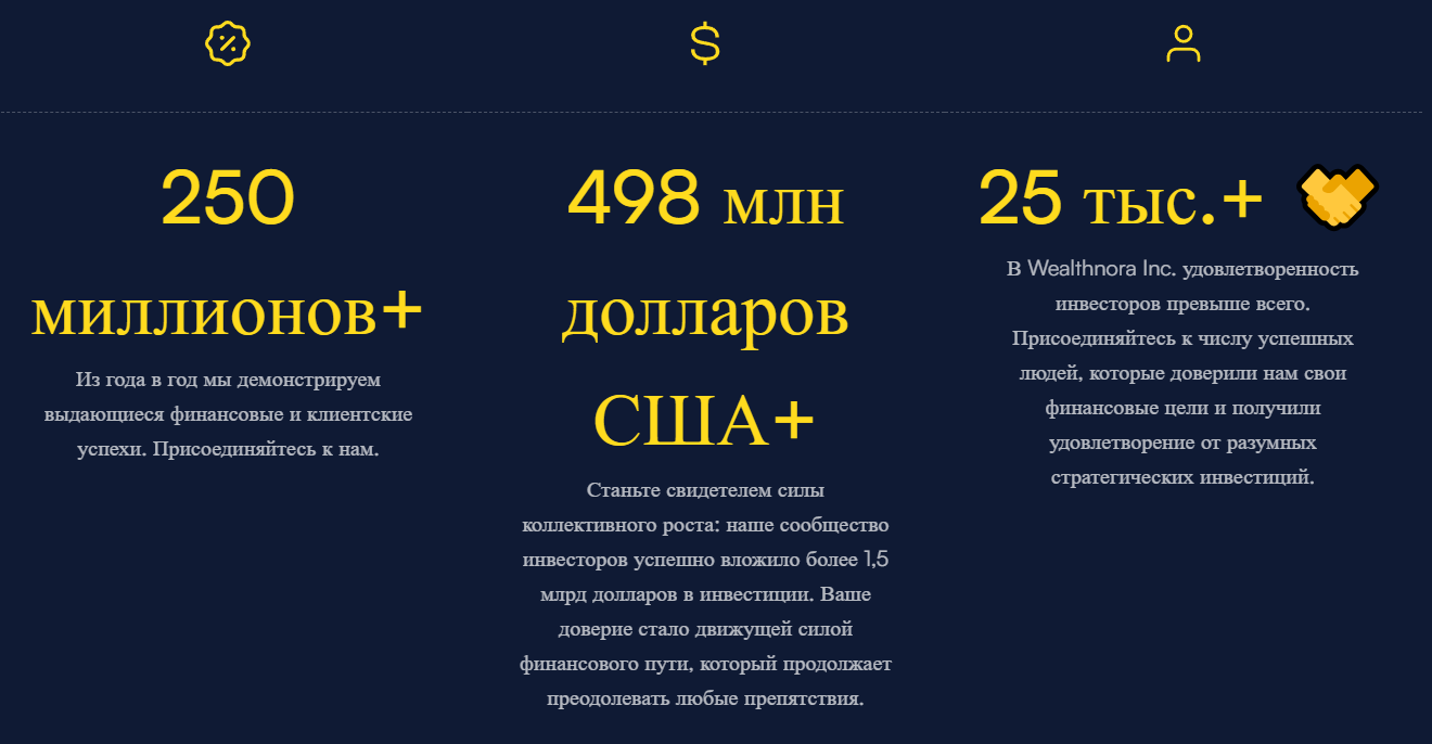 На первый взгляд, Wealth Nora выглядит как мечта инвестора. Сайт пестрит впечатляющими цифрами: совокупный объем торгов якобы превышает 498 миллионов долларов, а число активных инвесторов достигло 25 тысяч. Миссия компании — ни много ни мало «создать финансово надежное будущее для всех». Звучит красиво. Но как только мы начинаем проверять факты, эта красивая картинка рассыпается на части.