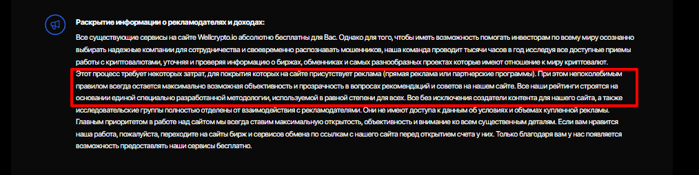 Администрация WellCrypto получает доход с реферальных ссылок, как и другие площадки мониторинга. В каждой карточке обмена есть описание сервисов. Также подключена реферальная программа криптовалютных бирж.