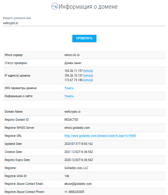 Домен wellcrypto io зарегистрировали в конце 2021 года, о его владельцах ничего неизвестно.