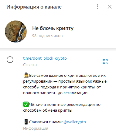 Также WellCrypto занимается продвижением телеграмм-канала «Не блочь крипту». На @dont_block_crypto подписано всего 98 пользователей.Новые посты не выходят с 2022 года, контент включал обзоры на криптовалюты и новостные посты.