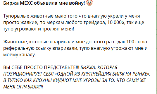 В телеграмм-канале White Raven можно заметить разоблачение на некую биржу Mexc, которая, по словам опытного трейдера, обманула его на крупную сумму. В своих постах автор обращается в грубой форме к бирже, говорит о невозможности торговли на ней и сливает все известные ему данные о ней.