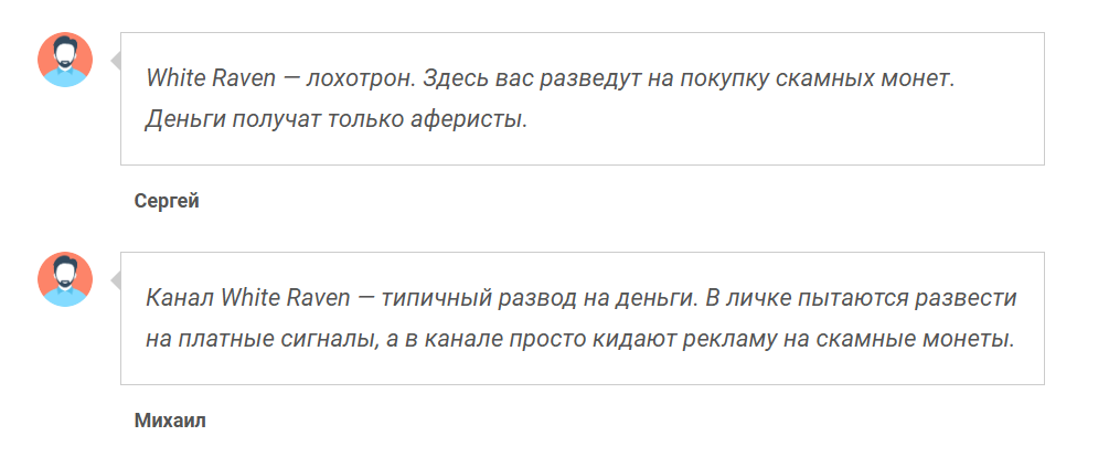 Whiteraven btc отзывы уже успел собрать, но большинство из них – негативные. В них пользователи отмечают, что при работе с каналом они потеряли свои средства, большинство советов оказываются неправильными, а сам проект выдает себя за совершенно другую контору. Довольных комментариев практически нет, только доказательства мошеннической деятельности. Пользователи жалуются, что сам проект рекламирует скам монеты, при этом продавая свои услуги по заработку.