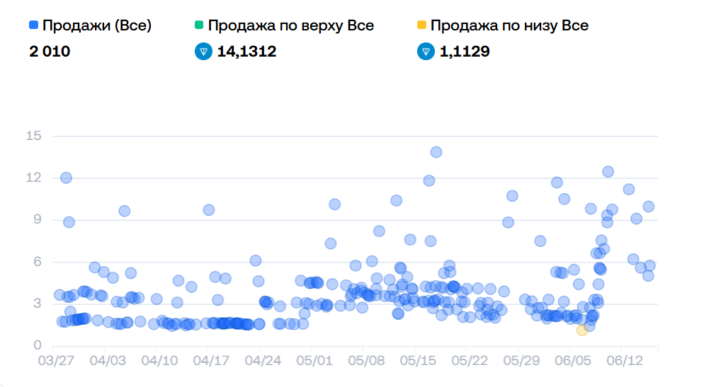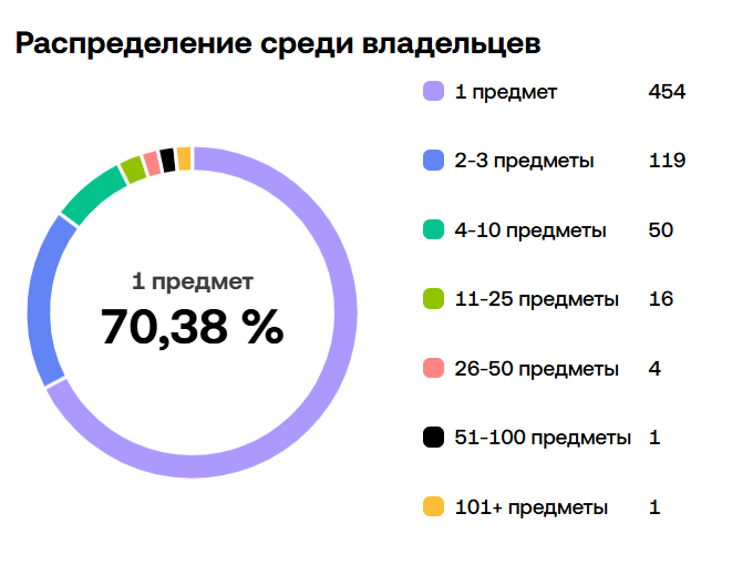 Общий объём НФТ на июнь 2025 года – 8 310 TON или примерно $25,000. Минимальная стоимость актива на площадке OKX Маркет – 6 TON или примерно $18. Низкий коэффициент уникальных владельцев указывает на то, что коллекция находится под угрозой манипулирования. За последнюю неделю на момент написания обзора, 17.06.2025, было продано НФТ на 684 TON за 82 сделки. За всё время нахождения Winter Wreaths на бирже было совершено чуть больше 2 000 обменов. Распределение среди владельцев выглядит следующим образом: