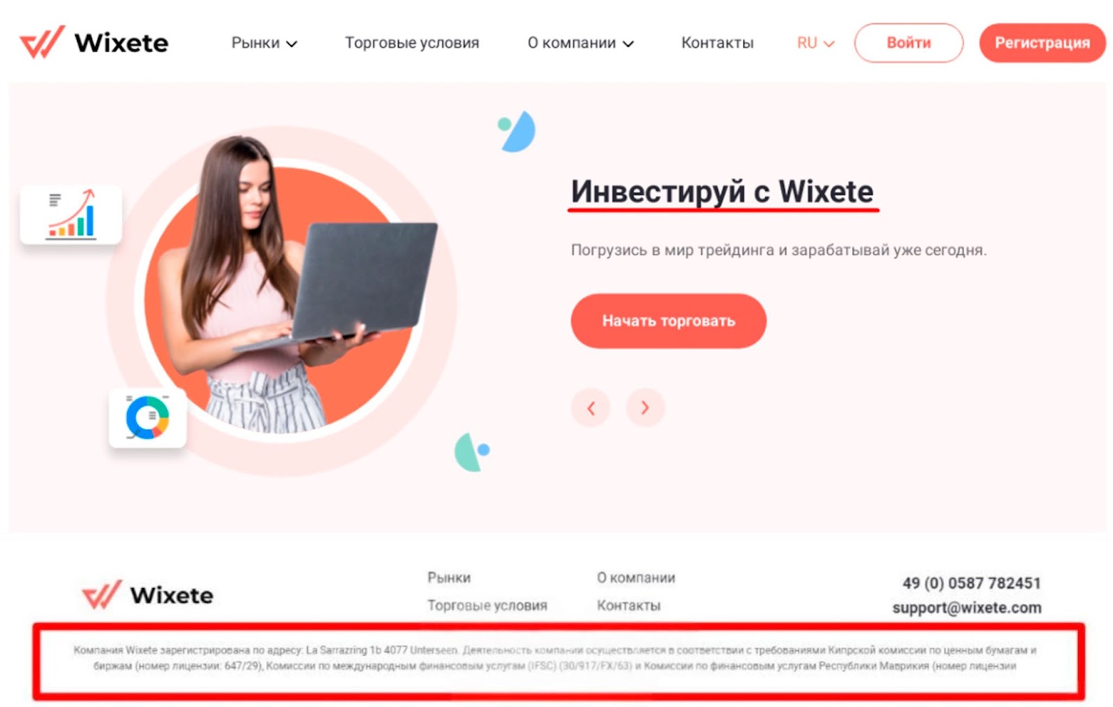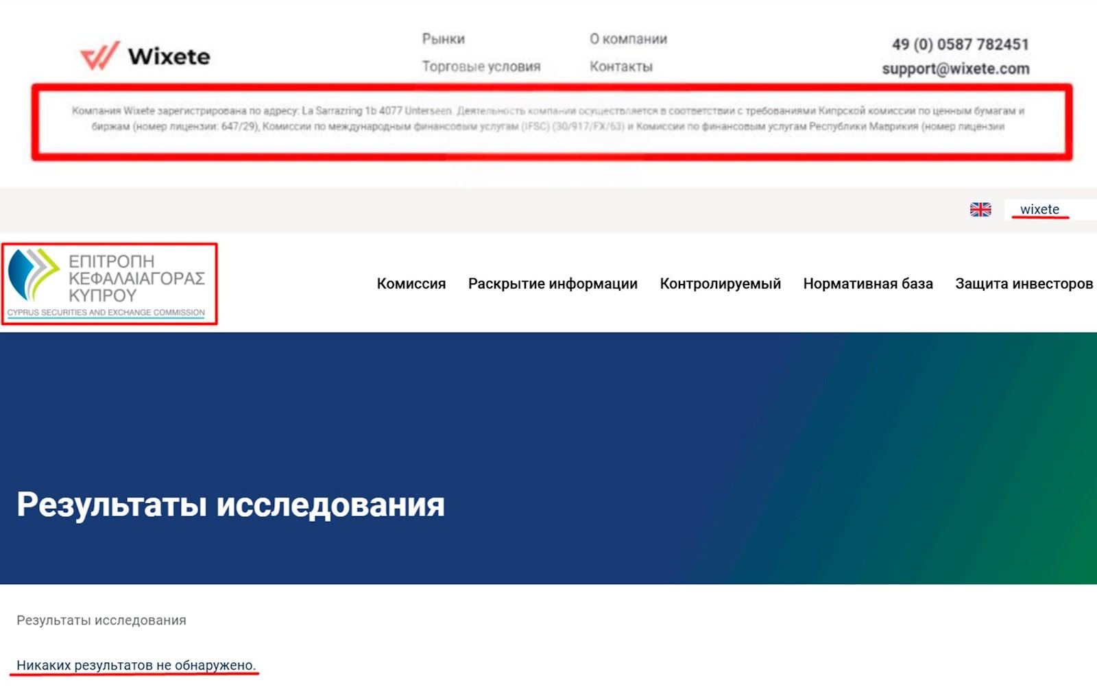 Данные о торговых лицензиях wixete выглядят как фейковые. Например, на сайте Кипрского регулятор CySEC отсутствуют сведения о wixete. Можно сделать вывод, что деятельность брокера юридически не регулируется, что создает потенциальный риск для пользователей.