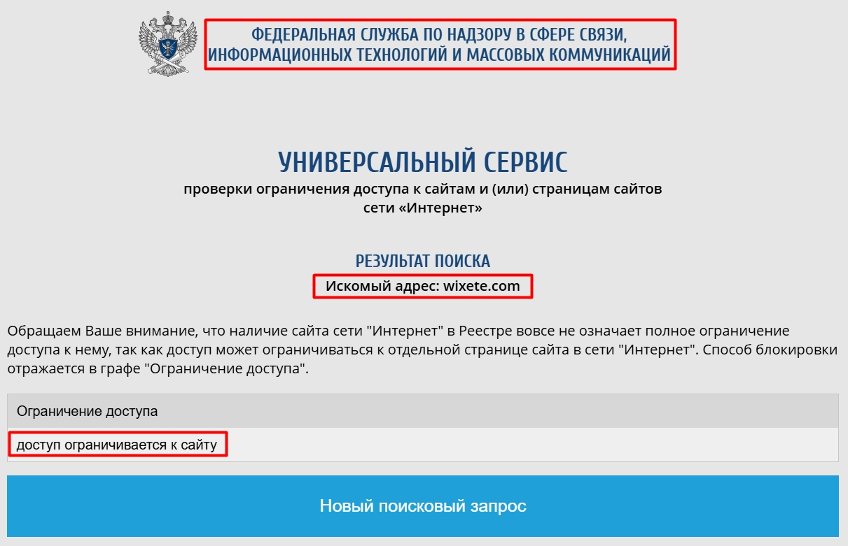 На сайте федеральной службы по надзору в сфере связи, информационных технологий и массовых коммуникаций можно найти сведения, что доступ к домену wixete com ограничен. Точная дата внесения веб-ресурса в реестр блокировки не сообщается.