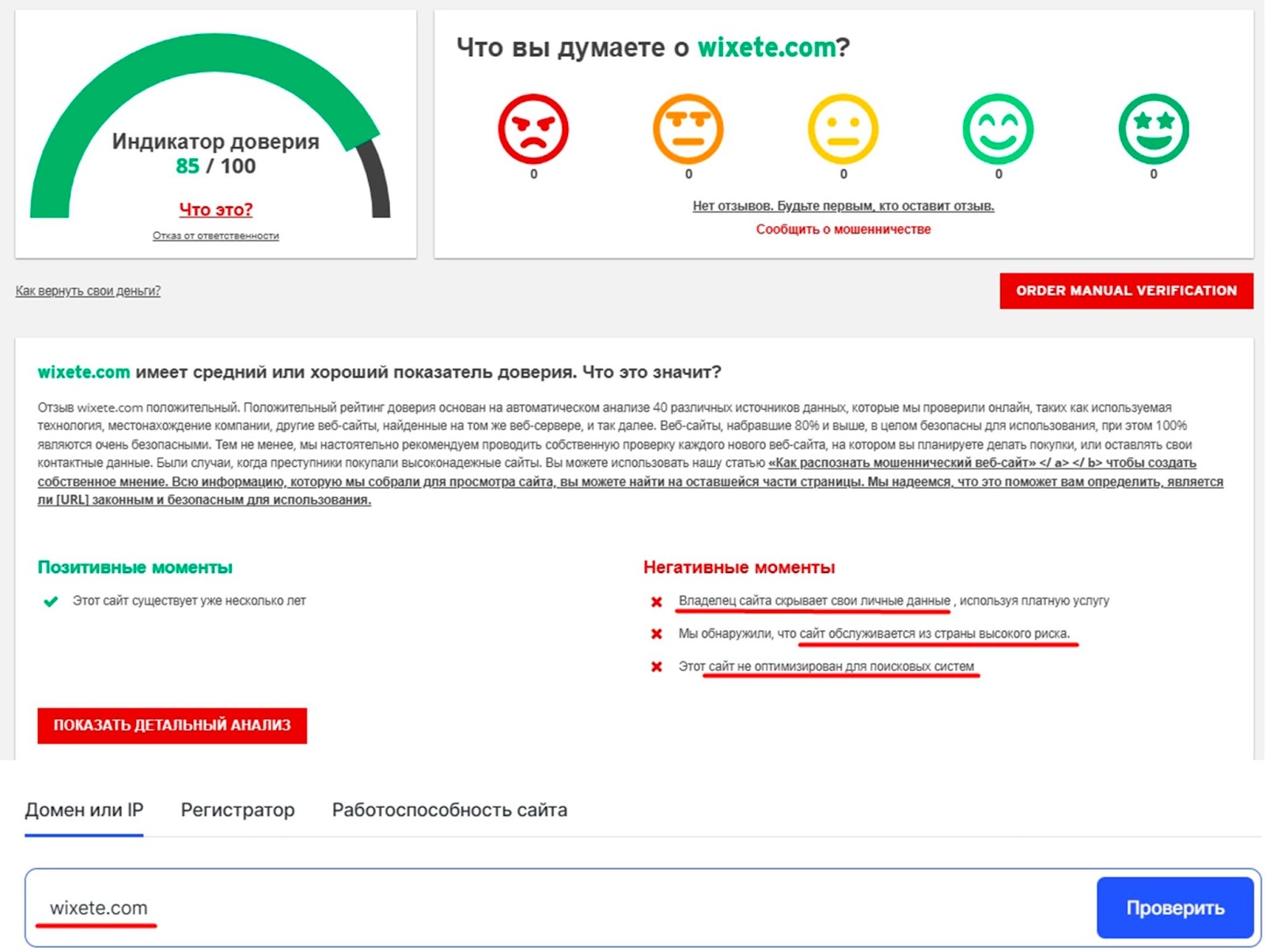 У домена wixete com средний рейтинг доверия. Но сайт не оптимизирован и обслуживается из стран с высоким риском мошенничества. На 15 декабря 2024 года доменное имя свободно.