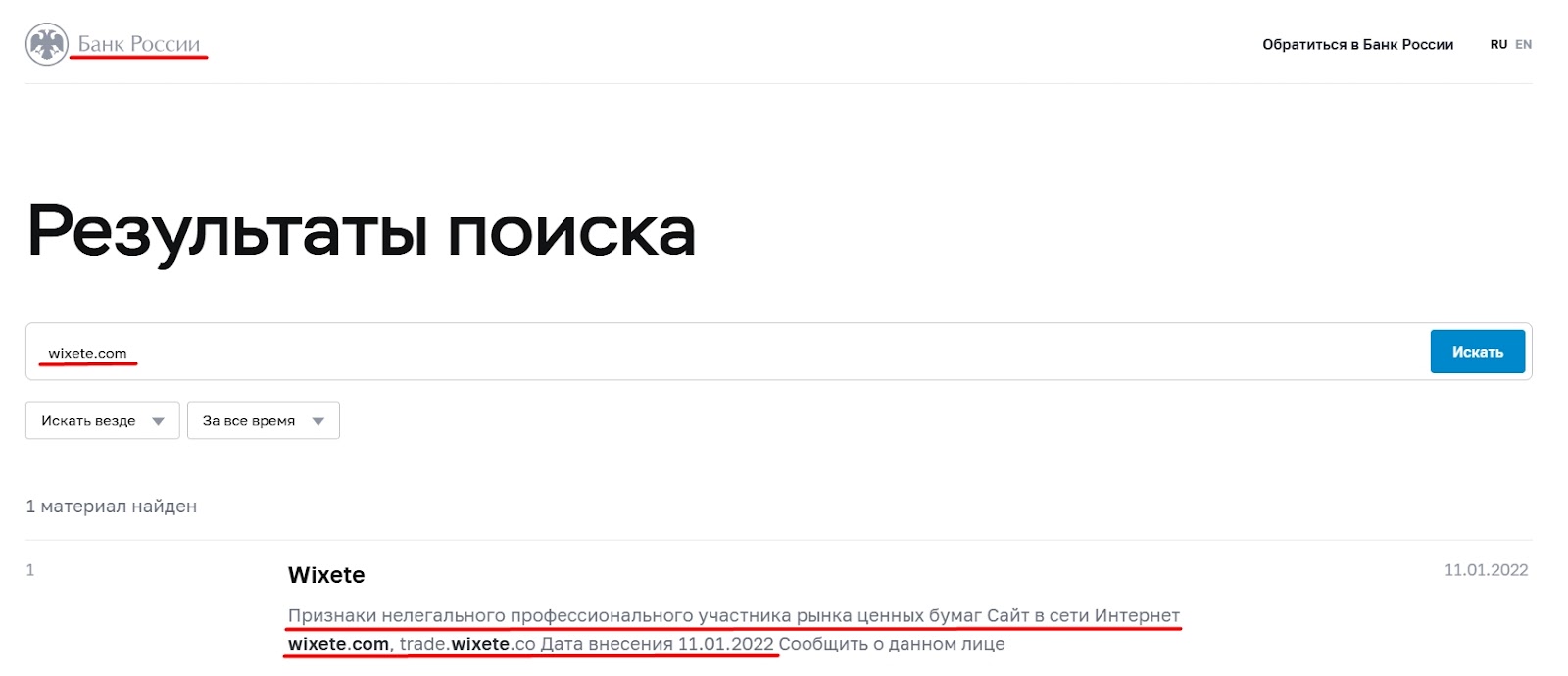 Брокер виксете не имеет лицензии национального Банка России. Для финансовых услуг на территории РФ торговые представители должны регулироваться. Дополнительно на сайтах wixete com и trade wixete co выявлены признаки нелегального участника рынка ценных бумаг.