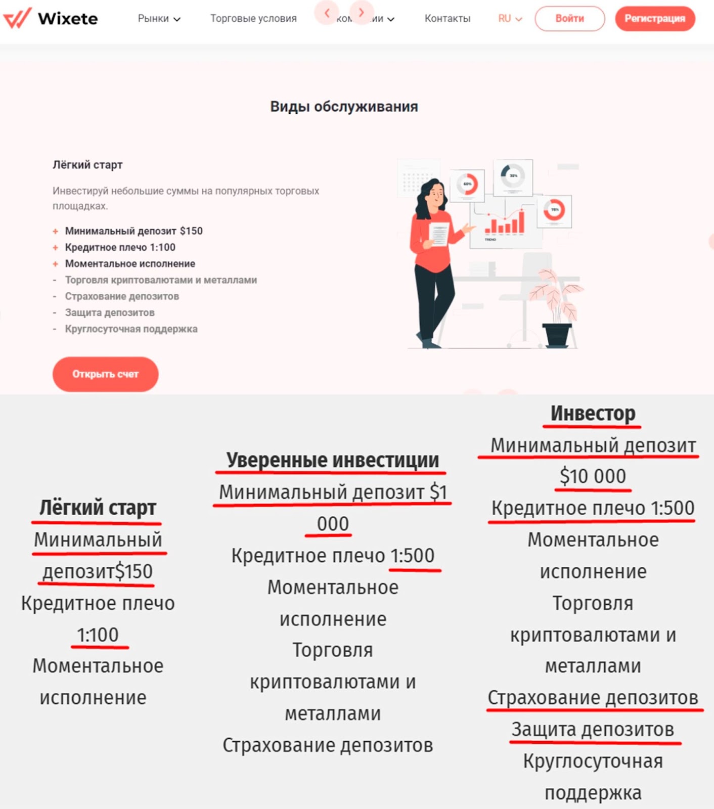 Wixete предлагают трейдерам 3 варианта депозитов с уникальными бонусами. Например, базовый счет доступен от 150$ с кредитным плечом 1:100, но недоступна торговля криптовалютой, страхование баланса и обслуживание техподдержки.