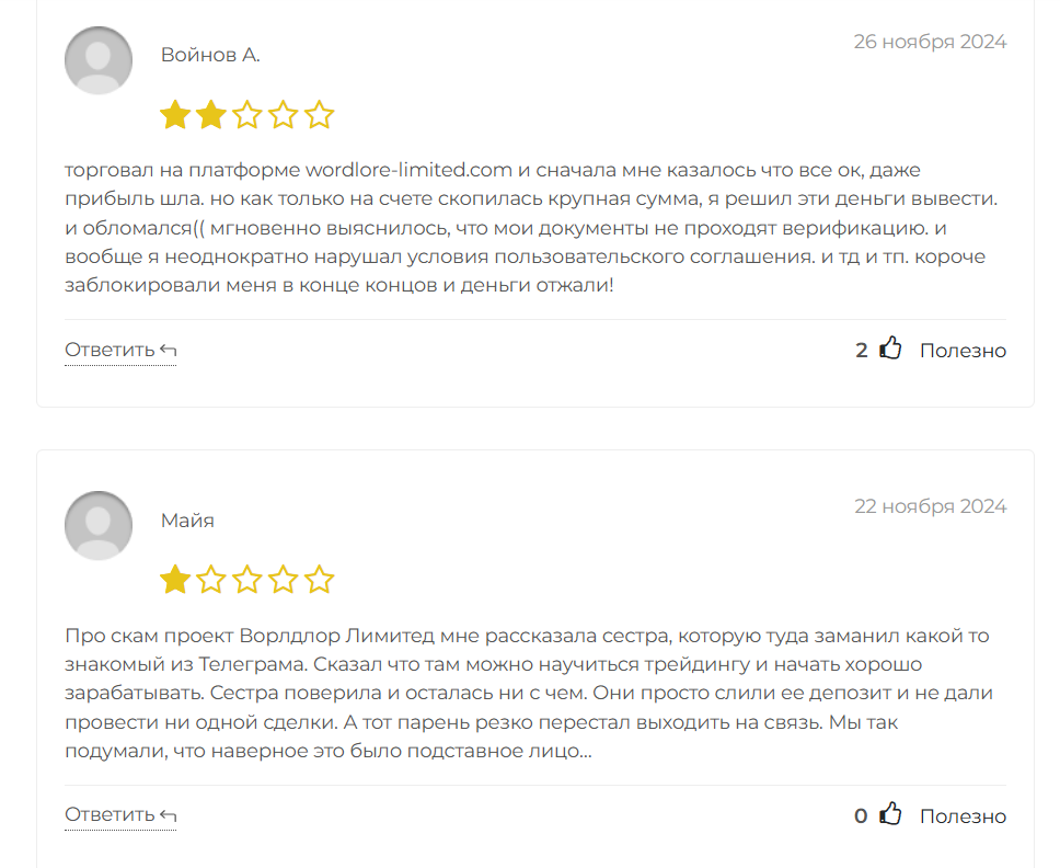 Удивительно, но о платформе wordlorslimited com отзывы в сети негативные, и это всего за 43 дня существования брокера. Пользователи делятся, что пожалели о сотрудничестве с компанией. Согласно отзывам, первое время работы на бирже все идет хорошо, в личном кабинете даже отображается начисление прибыли. Но, как только пользователь делает заявку на вывод, сразу выясняется, что ему необходимо пройти верификацию. Далее клиенту неоднократно дают ответы с ошибками в этой процедуре, после чего просто сообщают, что трейдер неоднократно нарушил пользовательское соглашение, и блокируют личный кабинет. Вернуть потраченные деньги обратно невозможно.