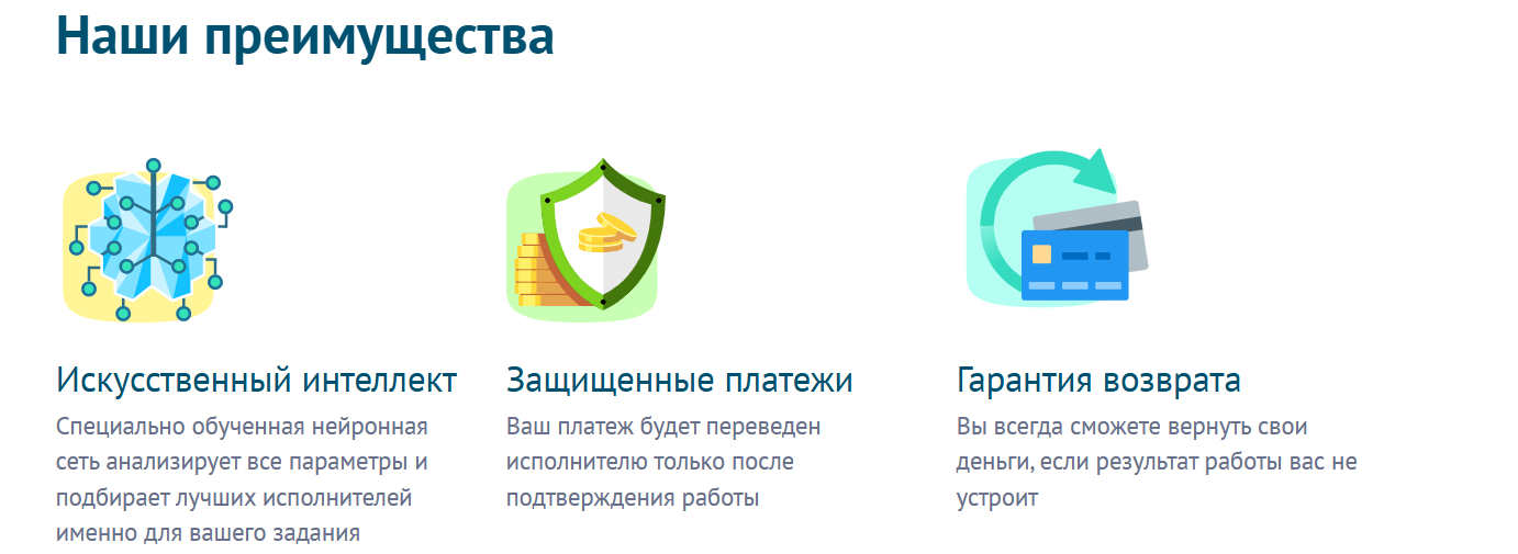 На сайте основатели сервиса перечисляют свои главные конкурентные преимущества. Внимание посетителей акцентируется на внедрении ИИ. Нейросеть анализирует все параметры заказа и подбирает лучших исполнителей. Платёж поступит на счёт исполнителя только после выполнения задания, а если результат не устроит заказчика, он всегда может вернуть деньги.