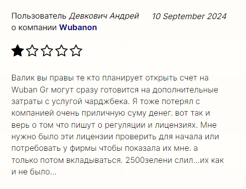 Мы подробно изучили доступные отзывы wubanon клиентов в сети. Многие говорят о мошенничестве брокера и характеризуют его работу негативно. Среди недостатков можно отметить отказ возвращать деньги клиентам, отсутствие ответа от клиентской службы и попытки навязать дальнейшие инвестиции.