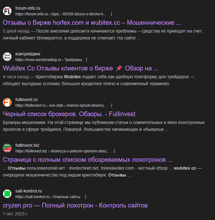 Полноценных и верифицированных отзывов у Wubitex нет и это неудивительно, учитывая реальный срок работы площадки. Но при попытке искать материалы по ней в поисковиках можно увидеть массу статей и обзоров, где она обвиняется в мошенничестве.