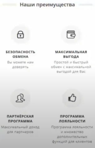 Скрины с сайта обменника показывают, что справа и слева от валют перечислены преимущества использования сервиса.