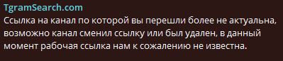 По данным с TgramSearch – ссылки на ТГ-канал «более не актуальна», допускается возможность смены ссылки или удаления.