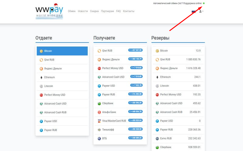 Организация обменивает валюты в любой удобный момент времени и работает 24/7 в автоматическом режиме, техподдержка активна всегда и без выходных, но прежде чем вы захотите связаться с ней – настоятельно рекомендуем посмотреть, активна ли она. Это можно сделать просто посмотрев в правый верхний угол сайта, если кнопка горит зелёным и написано «Поддержка online», то звонить можно, если же нет – придётся подождать.