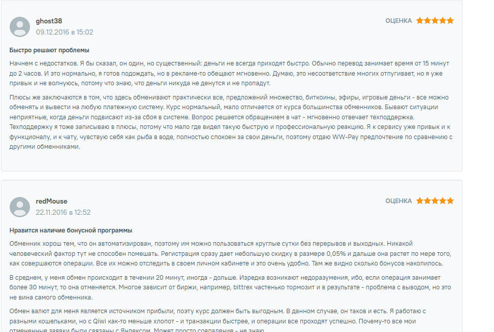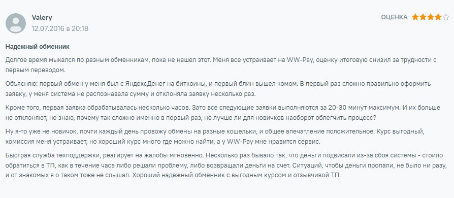 Вот ещё один отзыв о WW-pay. Валерий искал нормальный обменник и остановился на «Вв-Пэй». Первый перевод у него, конечно, не заладился – операции отклонялись неоднократно, да и скорость в несколько часов тоже сыграли свою роль.