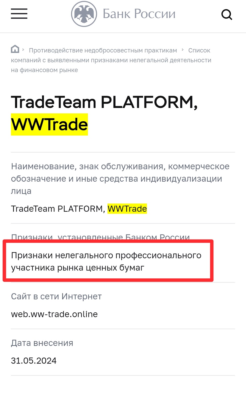 - WW Trade признан фейковым брокером с признаками развода и мошенничества. Следовательно, все действия на платформе связаны с большим риском потерять деньги и получить убыток.
