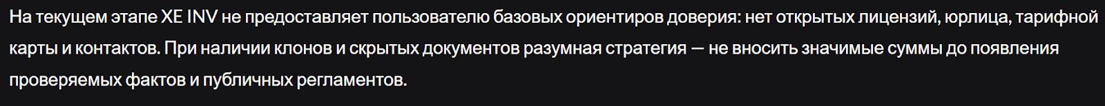 - Отсутствие у Xe-Inv com аккаунтов в социальных сетях и малое количество отзывов свидетельствует о низкой популярности проекта и отсутствии проверенного опыта у клиентов.