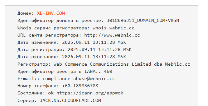 Внизу сайта указан 2023 год, но что это значит, непонятно, ведь судя по информации с Whois ru, домен зарегистрировали только 11.09.2025.Социальных сетей у проекта нет, поэтому узнать что-либо о бирже Xe Inv другими способами не получится, а в личном кабинете простейший терминал, где даже нельзя изменить таймфрейм.