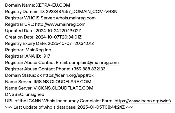 Чтобы узнать, когда валютный брокер и биржа Xetra начала работу, мы запросили данные домена xetra eu com из сервиса Whois. Выяснили, что он был выдан регистратором 7 октября 2024-го года.