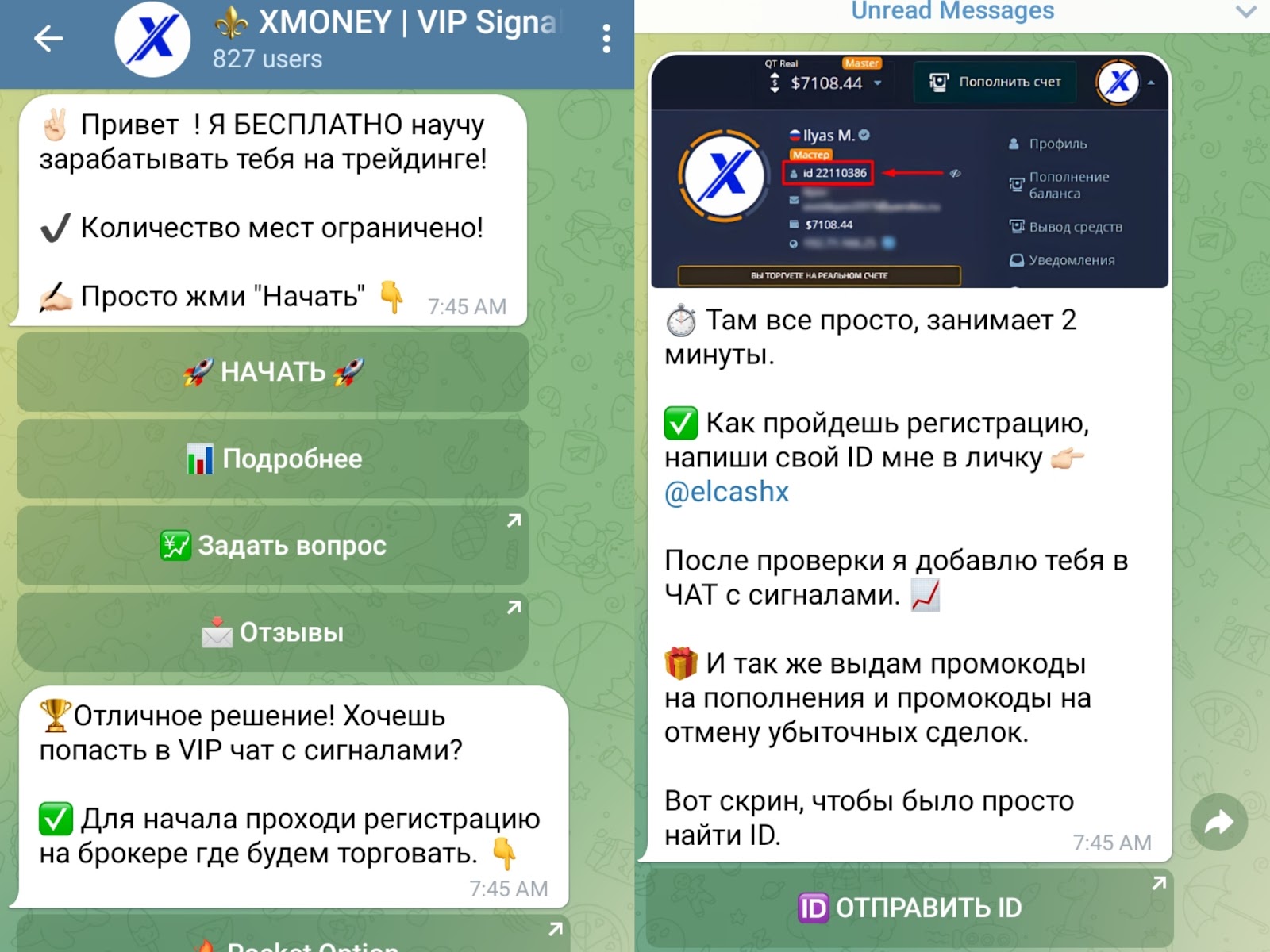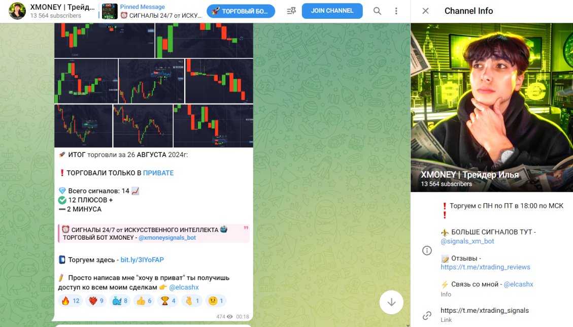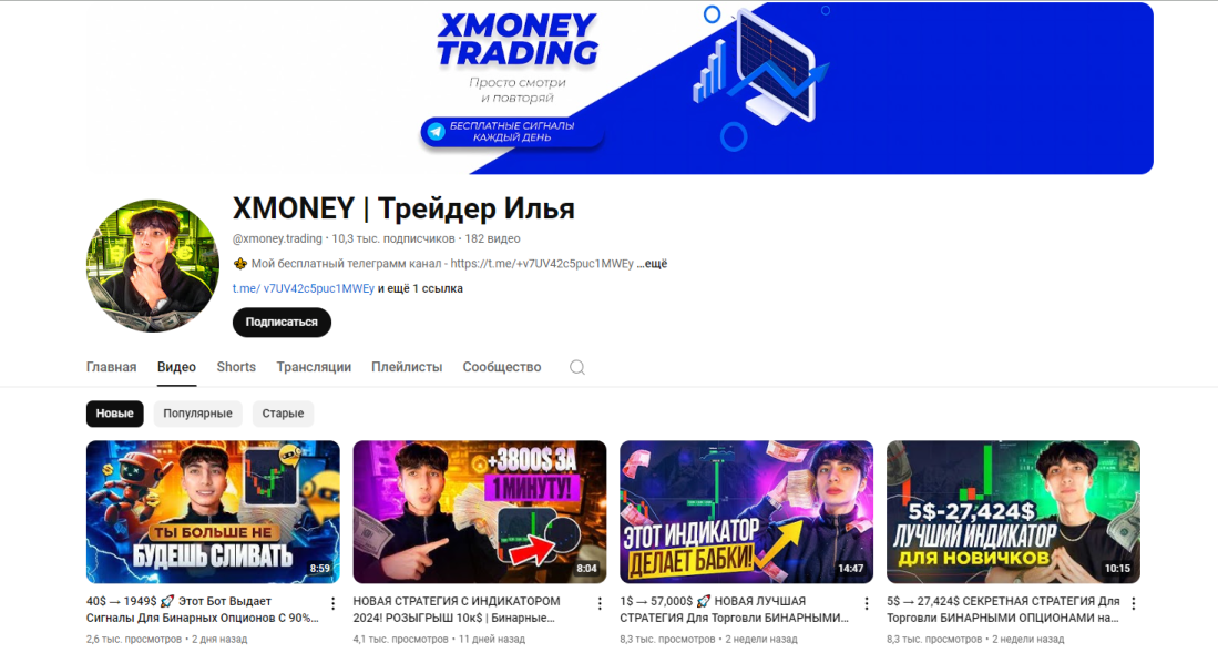 Здесь трейдер делится стратегиями по торговли бинарными опционами. Автор обещает пользователям большую прибыль за сотрудничество с ним.Помимо Телеграмма и Ютуба, у Ильи есть группа ВКонтакте ВКонтакте XMONEY Трейдер Илья Бесплатные сигналы (xmoney signal). Контент там идентичен другим страницам в социальных сетях.