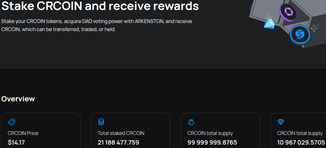 И последний инструмент — стейкинг от биржи Xrcswap com. Вкладывать можно нативные токены $CRCOIN. Стоимость 1 монеты — 14.17 долларов, всего застейкано — 21 188 477.759, общая циркуляция — 99 999 999.8765. В обиходе — 10 967 029.5705.