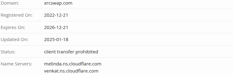 Неизвестно, с какого времени команда криптовиков стала заниматься посредничеством во время обменных операций. Информацию о старте проекта в сети мы узнали через аналитический инструмент WHOIS. Теперь известно, что разработчики сервиса работают в формате децентрализованной биржи Xrcswap com с 21.12.2022 года.
