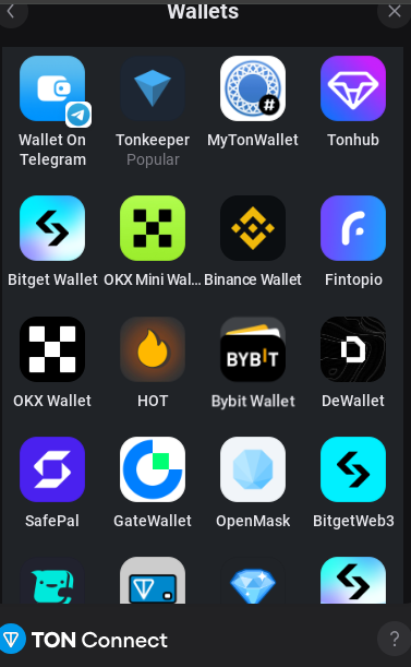 Чтобы получить доступ ко всем инструментам, надо подключить криптовалютный кошелек. Инфраструктура поддерживает свыше 10 крипто хранилищ, включая TonKeeper, MyTonWallet, Tonhub, Bitget Wallet, OKX, ByBit Wallet.