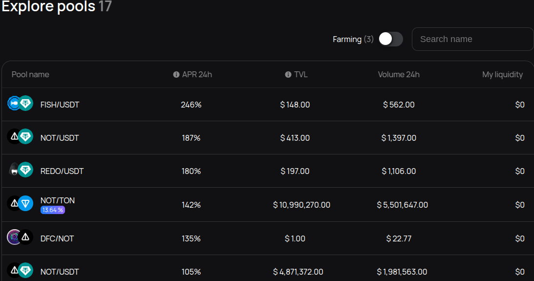 Второй инструмент — Pools. Пользователи могут пассивно зарабатывать на пулах ликвидности. Суточная доходность составляет от 6% и до 246% APR 24h. По минимальной стоимости входа информации нет.