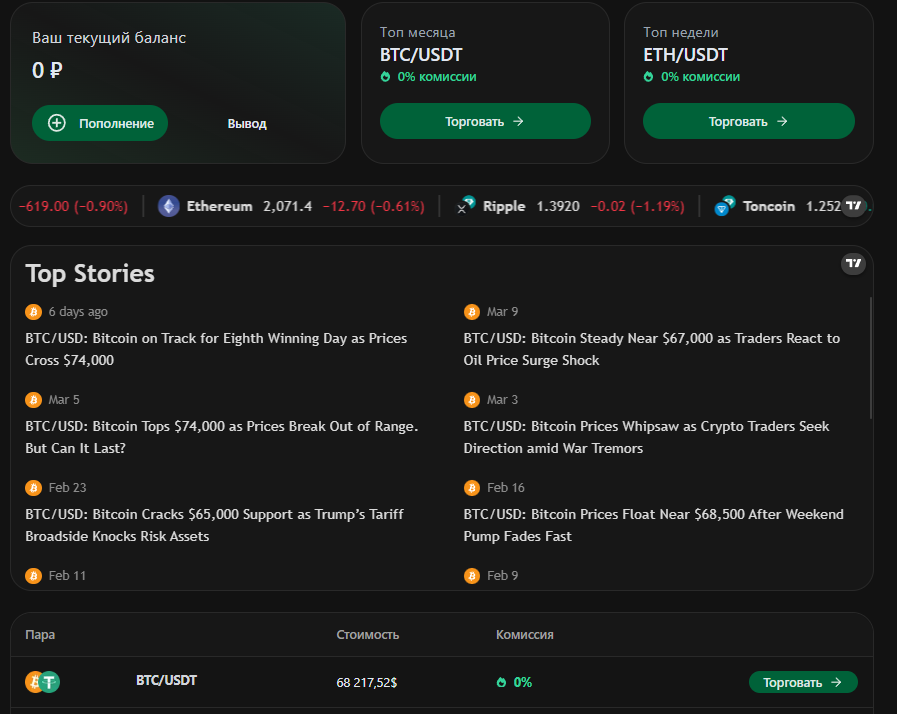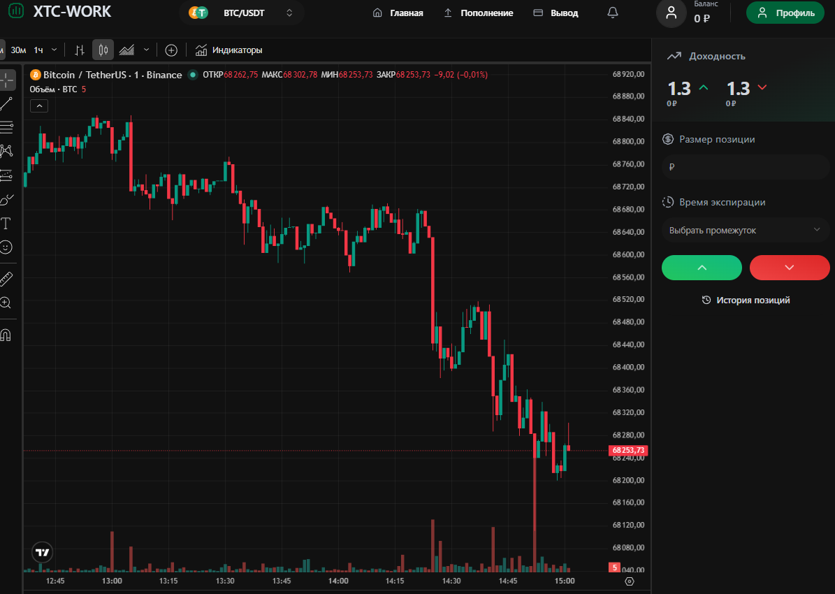 После регистрации открывается личный кабинет с балансом в рублях, разделами «Пополнение» и «Вывод», а также списком торговых пар. Интерфейс Xtc Work оформлен в темных тонах и внешне напоминает настоящую биржу.