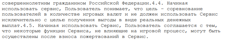- по условиям соглашения весь баланс считается игровым, поэтому пополнение счета – это добровольное пожертвование без гарантий возврата;