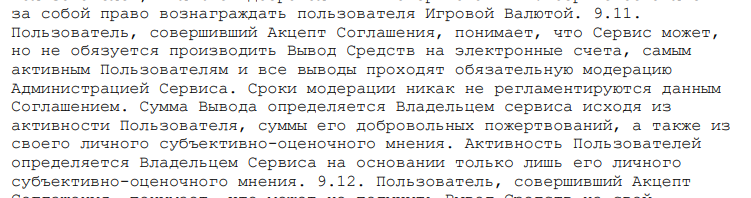 Пользовательское соглашение прямо указывает, что сервис – это игра. По документу цель проекта – соревнование пользователей в количестве игровой валюты, а не получение реального дохода. Весь баланс на счете считается игровым и не имеет отношения к настоящим деньгам.
