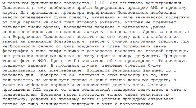 Пункт 11.14 описывает процедуру верификации для вывода денег: пользователю нужно внести на счет сумму до ₽50,000, после чего она якобы остается у него и идет на вывод вместе с выигрышем.