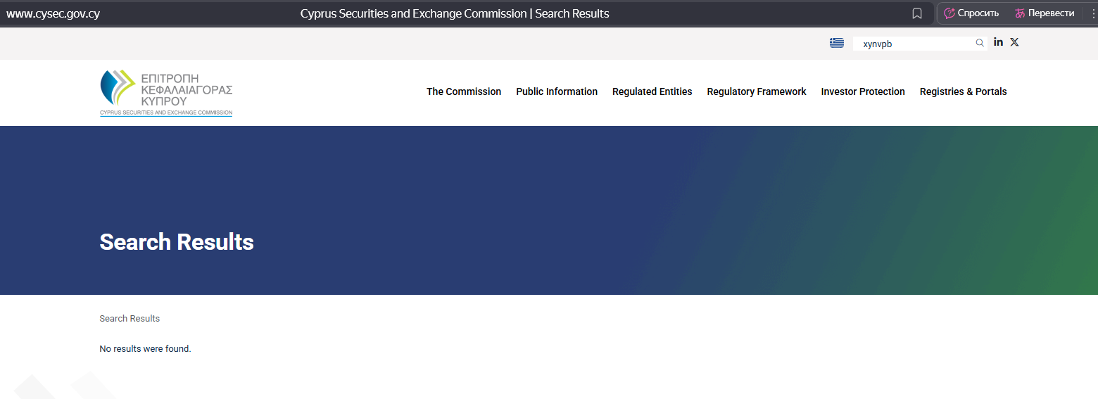 CySEC – это кипрский регулятор по сфере ЕС. Мы решили проверить, есть ли этот брокер в реестре надёжных организаций «СуСЕК». Оказалось, что нет и упоминания о биржевике.