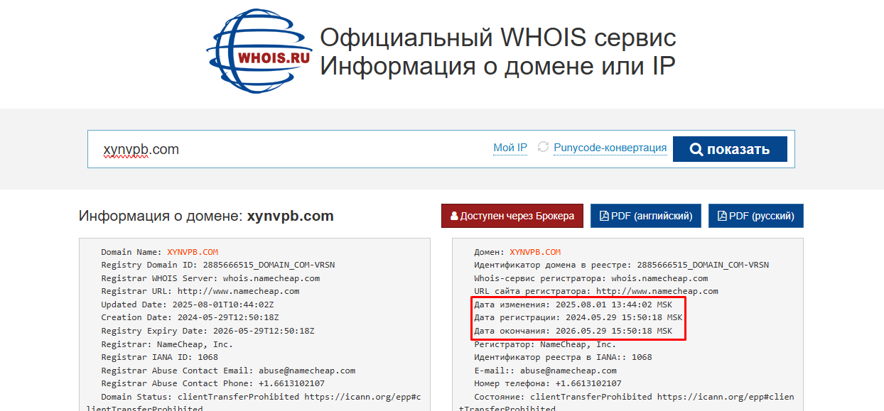Помимо лицензирования, мы проверили статус xynvpb com с помощью сервиса WhoIs.
