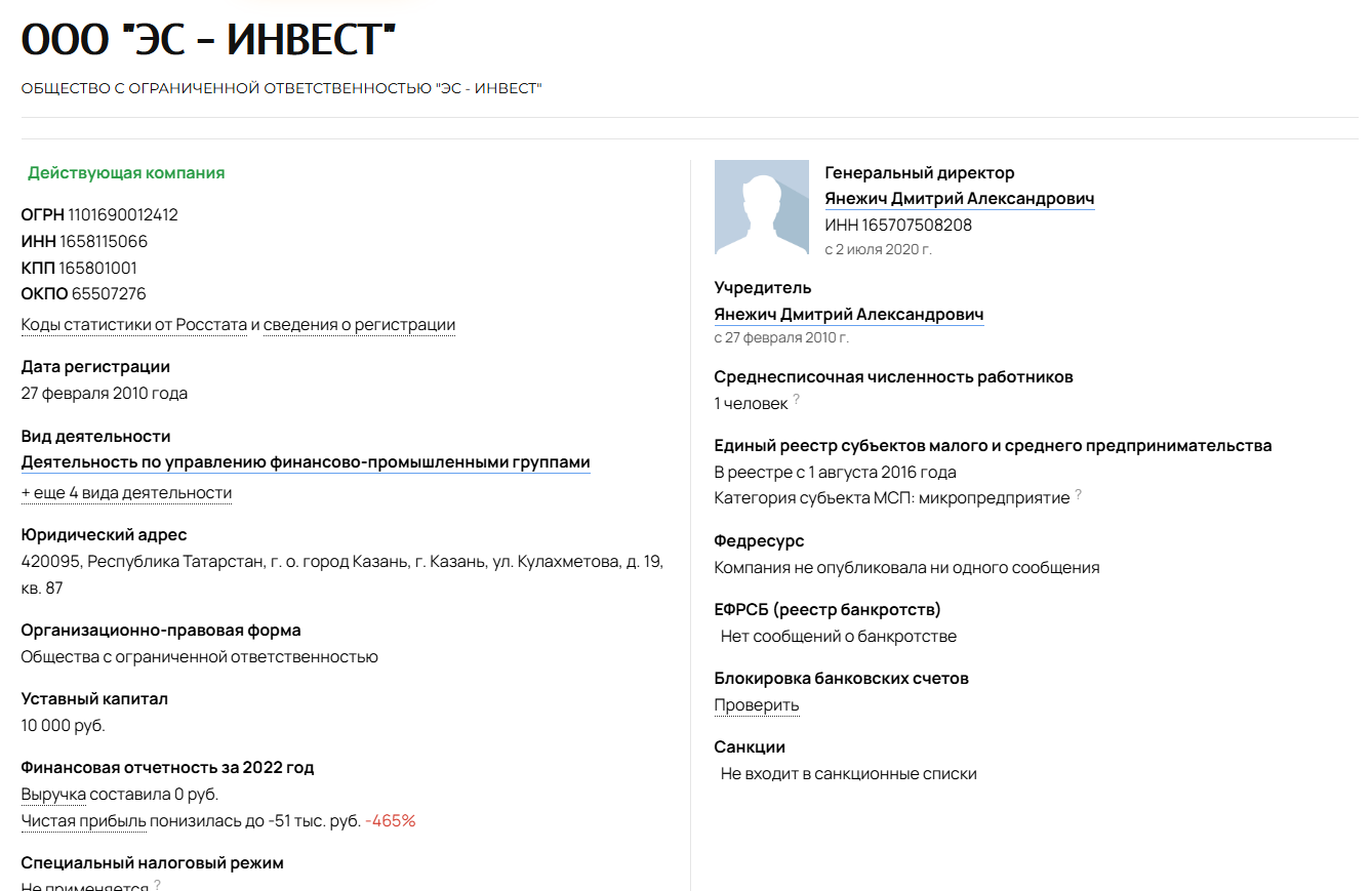 Компания «ЭС Инвест» под руководством Янежича Д.А. зарегистрирована для управления группами компаний, а также оказания консультационных услуг в области бизнеса, права и бухгалтерии. При этом фактически все перечисленные виды деятельности осуществляются единственным сотрудником — самим учредителем.Филиалов у компании тоже нет. По разным данным она вообще закрылась в июне 2024 года, однако все данные, ссылки на реестры и прочее, всё ещё находятся в открытом доступе с пометкой «работает».