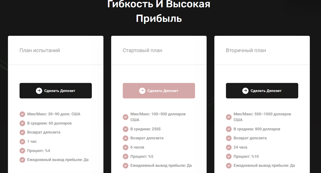 - стартовый план – размер депозита от 100 до 500 долларов, вернуть можно через 6 часов, доходность 5%;