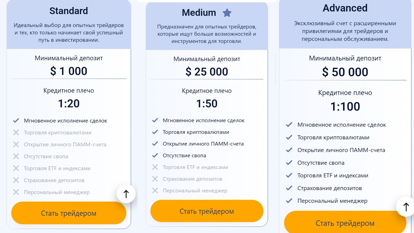 - Medium. Депозит от 25 тыс. долларов. Кред. плечо 1 к 50. Доступны криптовалюты. Трейдеры получат ПАММ-счет. Своп отсутствует;