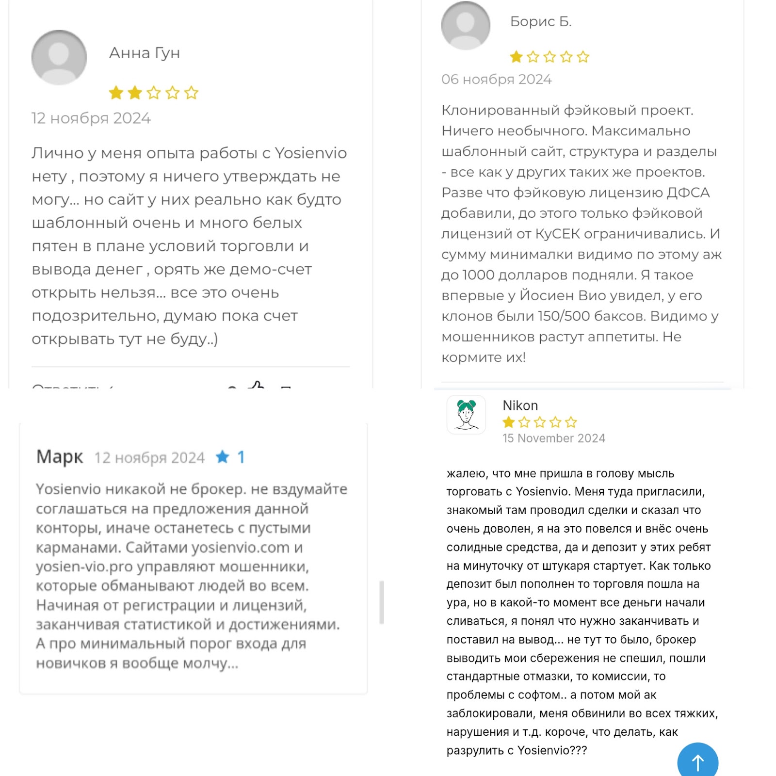 На сторонних платформах есть негативные отзывы о бирже Yosienvio (Yosien Vio Pro). По словам пользователей, официальный сайт выглядит шаблонно, а условия торговли сомнительные. Многие недовольны высоким минимальным депозитом.