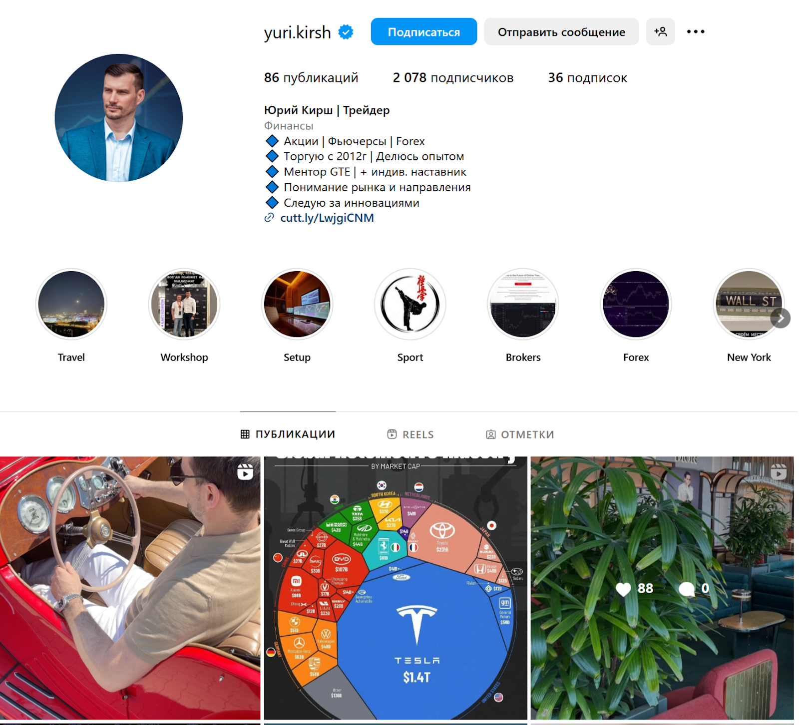 В качестве официальной страницы доступен профиль в Инстаграм по ссылке yuri kirsh. Здесь трейдер собрал аудиторию в количестве 2 тыс. человек, а число публикаций приближается к отметке 90. В сохраненных историях можно найти информацию по брокерам, рынку Форекс, работе и поездкам автора.